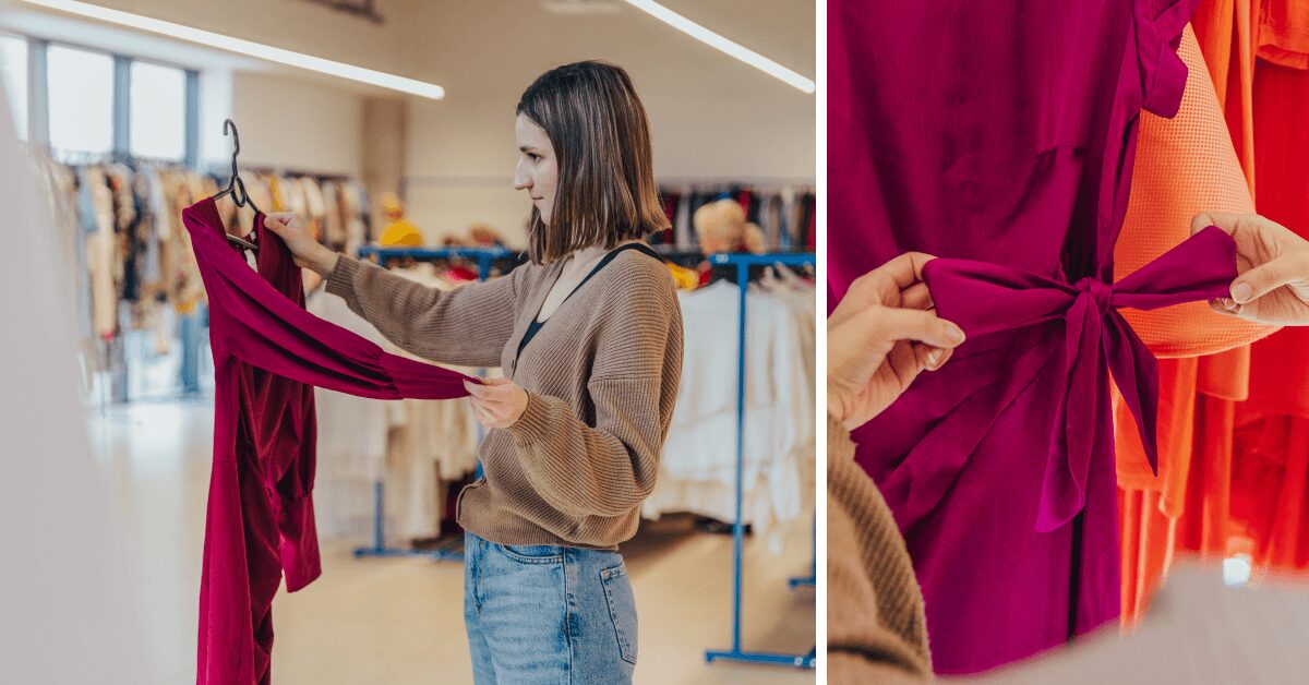 Wesele to czas, kiedy możemy nieco bardziej poszaleć z formą i kolorem, a jeśli nie wiesz, co ubrać na wesele, by nie wydać fortuny, a jednocześnie czuć się pięknie, to lumpeksy będą prawdziwym rajem dla poszukiwaczek wieczorowych kreacji. Od outfitów z lat 80. z ich przeskalowanymi ramionami, po współczesne trendy modowe – wybór jest nieograniczony. Miłośniczkom klasyki polecamy jedwabne sukienki na ramiączkach, które sprawdzą się nie tylko na weselu, ale i przy wielu innych okazjach. Taka baza jest niezwykle wdzięczna – wystarczy dodać do niej efektowną biżuterię, którą również często można upolować w sklepach z odzieżą używaną, by stworzyć look, w którym będziesz wyglądać jak milion dolarów. Jeśli to jednak nie Twój klimat, możesz być pewna, że na wieszakach znajdziesz kreacje w różnym stylu. Księżniczkowe sukienki przed kolano, zwiewne boho czy coś w stylu old money. Wybór jest naprawdę ogromny. Pamiętaj jednak, że diabeł tkwi w szczegółach. W second handach często trafiają się markowe torebki czy jedwabne apaszki, które mogą całkowicie odmienić Twoją stylizację. Dodatkowo wybierając ubrania z second handu, wzrastają szanse, że nikt nie będzie miał takiego samego outfitu.